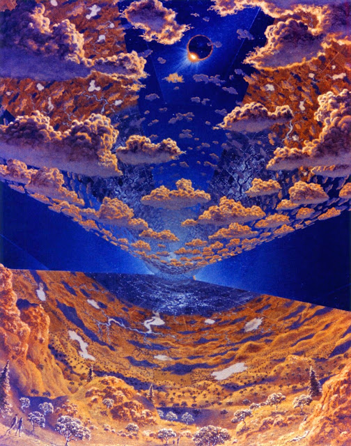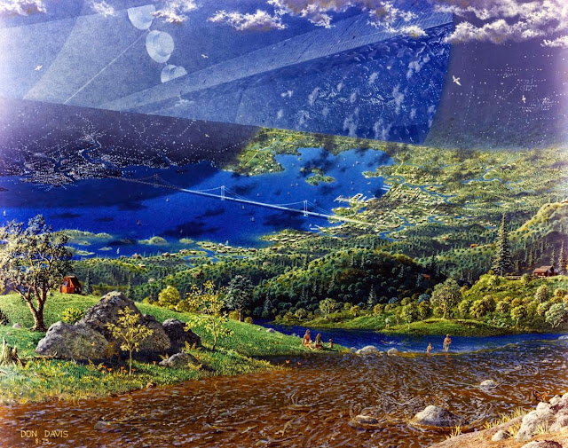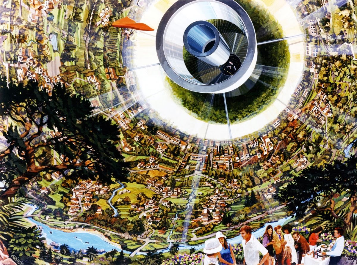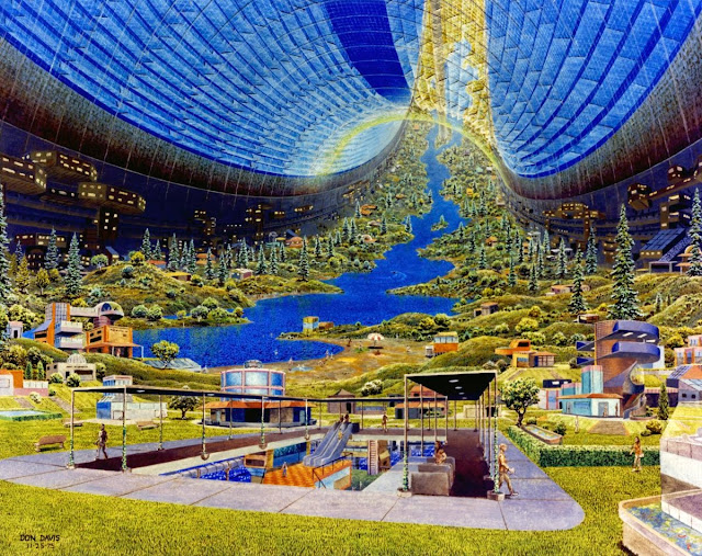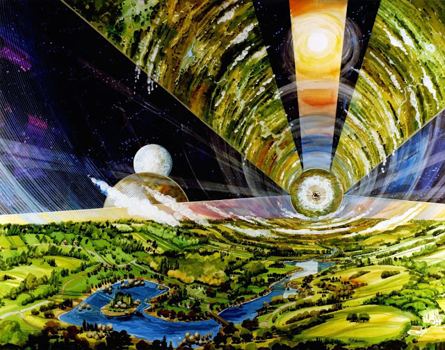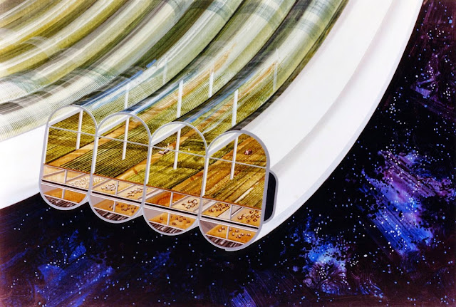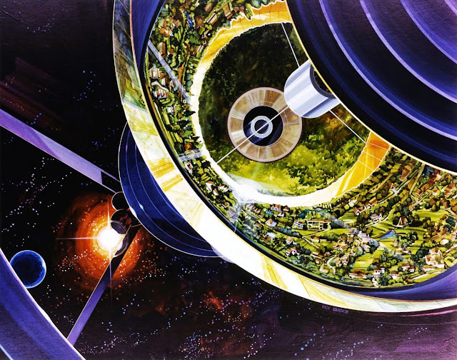 Давно мы не писали о будущем с точки зрения прошлого (палеобудущем). В 1970-е годы НАСА организовало несколько летних школ, участники которых работали над созданием концепциями будущих космических колоний. На основании этих дизайнов художники изготовили вот эти иллюстрации. Каждая представленная колония представляет собой поселение размером в "калифорнийский пляжный городок" с полным циклом самообестпечения, искусственной гравитацией, системами регенерации воды и погоды. Дизайнеры сошлись на трёх основных типах колоний: тороидальной, сферической и цилиндрической. В каждом случае объект вращается для симуляции гравитации Земли. Предполагалось, что материалы для строительства колоний будущие жители смогли бы добыть на Луне и астероидах. На земной орбите существует 5 так называемых "точек Лагранжа" или "точек либрации" (точки Лагра́нжа, точки либра́ции (лат. librātiō — раскачивание) или L-точки — точки в системе из двух массивных тел, в которых третье тело с пренебрежимо малой массой, на которое не действуют никакие другие силы, кроме гравитационных сил со стороны двух первых тел, может оставаться неподвижным относительно этих тел). Дизайнеры сошлись во мнении, что точки Лагранжа L4 и L5 были бы идеальными местами для помещения там космических колоний.