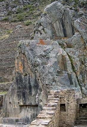 Слева и справа кликабельные виды той самой скалы в Ольянтайтамбо, которую перескочил Давиденко на большой скорости, отвесив на скаку звонкую оплеуху стороннику палеоконтакта Дэникену, вместо своих объяснений появления таких ровных ниш, никаким боком не сочетающихся с бетоной версией и доской Весельчака даже гипотетически.